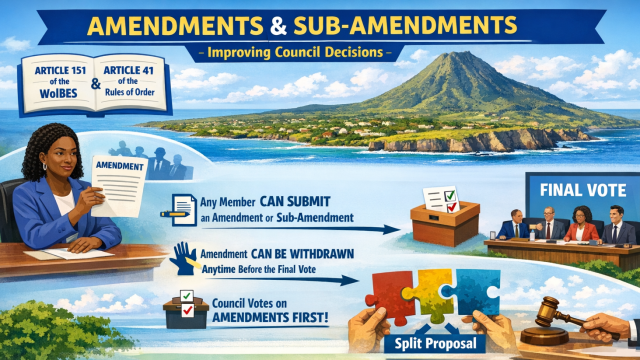 The right of amendment is set out in Article 151 of the WolBES. This law requires the Island Council to make its own rules on how amendment works. These further rules are written in Article 41 of the Rules of Order for Meetings and Other Proceedings of the Island Council Sint Eustatius, adopted on 20 November 2025.